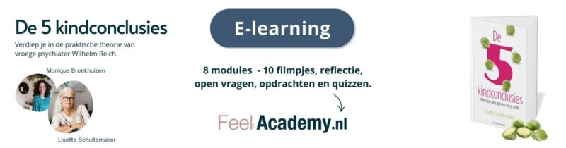 Vijf jaar geleden kwam ze met het idee voor een bijscholing die we een paar keer life gaven. Nu heeft ze deze e-learning gebouwd. In 8 modules neem ik je mee in de achtergrond en verborgen krachten van elk van de 5 kindconclusies. Met testjes, reflectievragen en quizzen toets je hoe je je deze materie eigen maakt. Als je ons de eindtoets stuurt, krijg je van ons een certificaat.